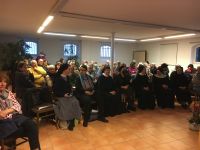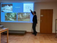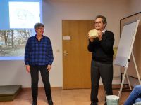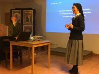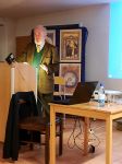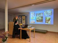 Prof. Stanzl berichtete von den ersten wissenschaftlichen archäologischen Grabungen in den 1980er Jahren auf dem Klosterberg. Dessen Erweckung aus einem Dornröschenschlaf gingen mit neuen Erkenntnissen zum Kloster und seiner Vorgeschichte einher. Die Untersuchung und bauliche Instandsetzung der seit dem 19. Jahrhundert vergessenen Ruinenmauern führten schließlich zum Bau eines kleinen Museums und einer großen Ausstellung 1998 in Mainz. Sie gaben dem Interesse an Hildegard und ihren Werken neue Nahrung und brachten den konkreten Ort ihres ersten Wirkens, bevor sie nach Bingen ging, ins Bewusstsein einer größeren Öffentlichkeit.